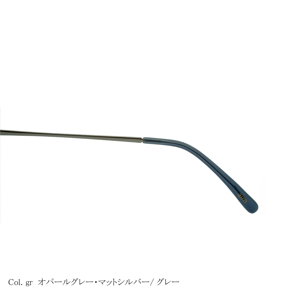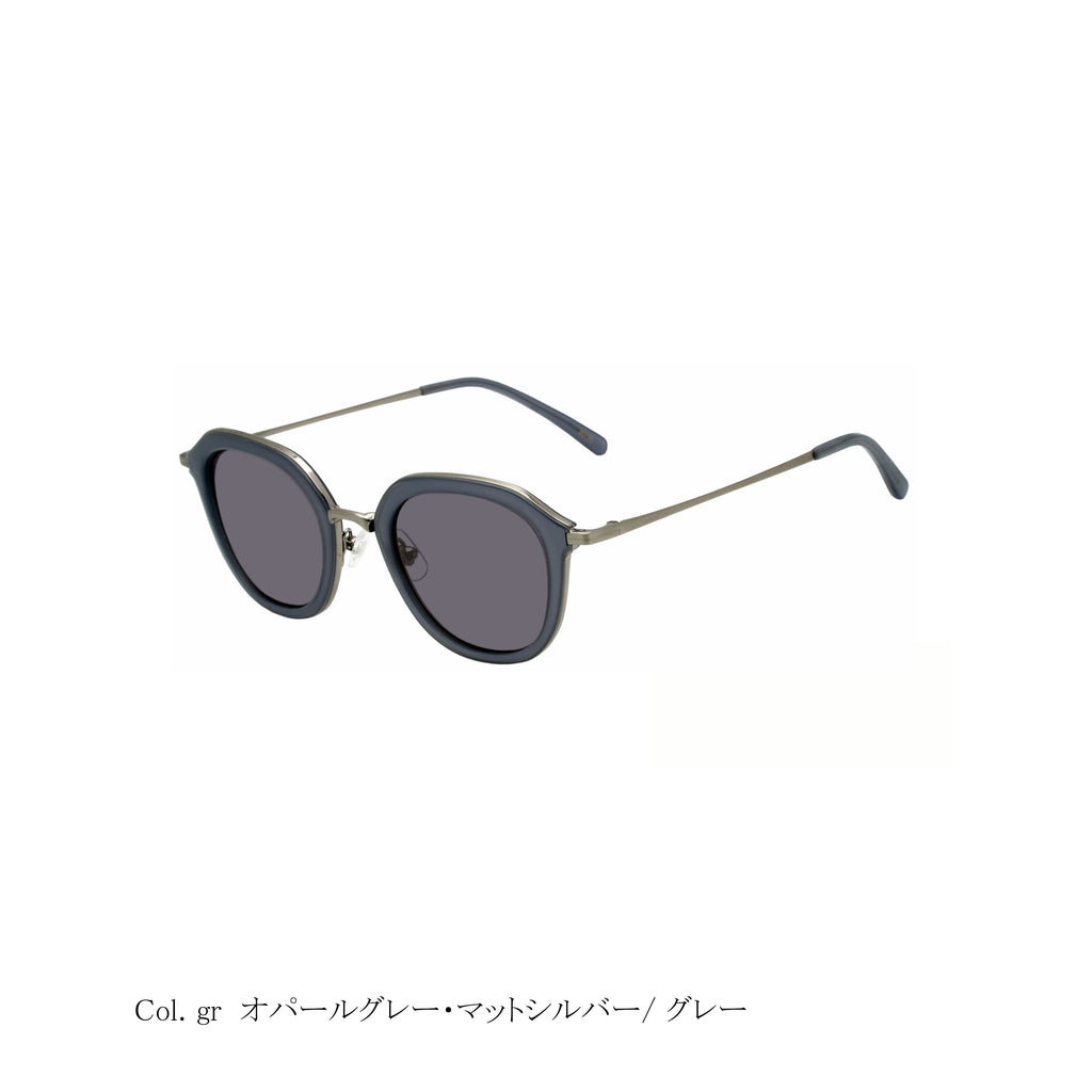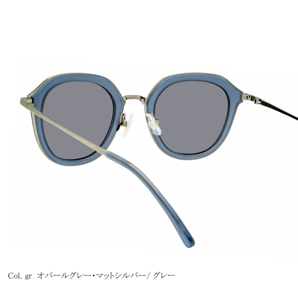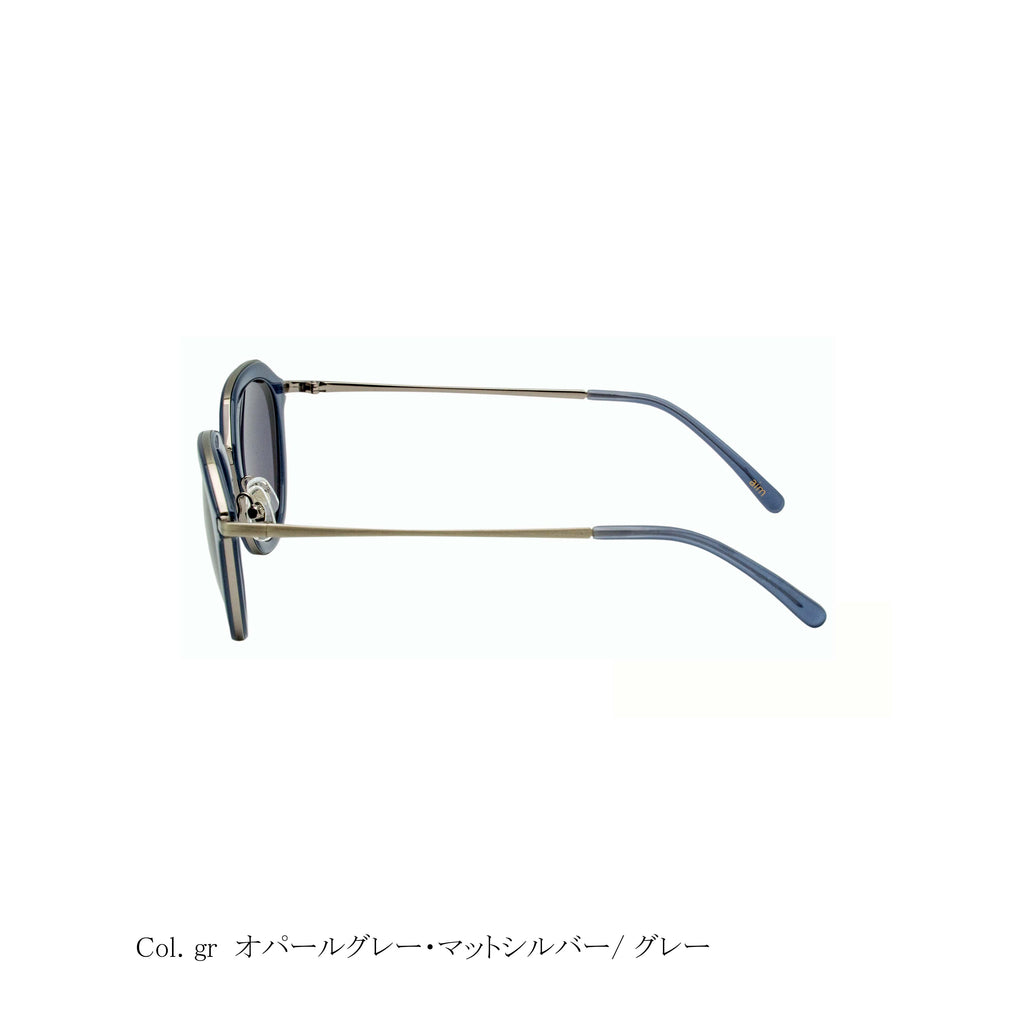 アセテート生地にはペールト-ンカラーを使い、メタル素材、シェイプの持つクールさとの調和を上手く図っています。